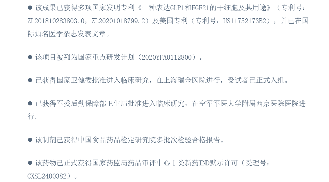 依托海南博鳌乐城国际医疗旅游先行区“先行先试”的政策优势,宁光院士团队主导的GLP-1/FGF21双靶点基因修饰干细胞项目已纳入博鳌乐城获批临床转化应用项目名单。